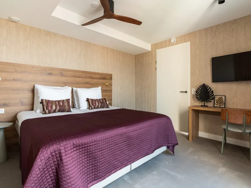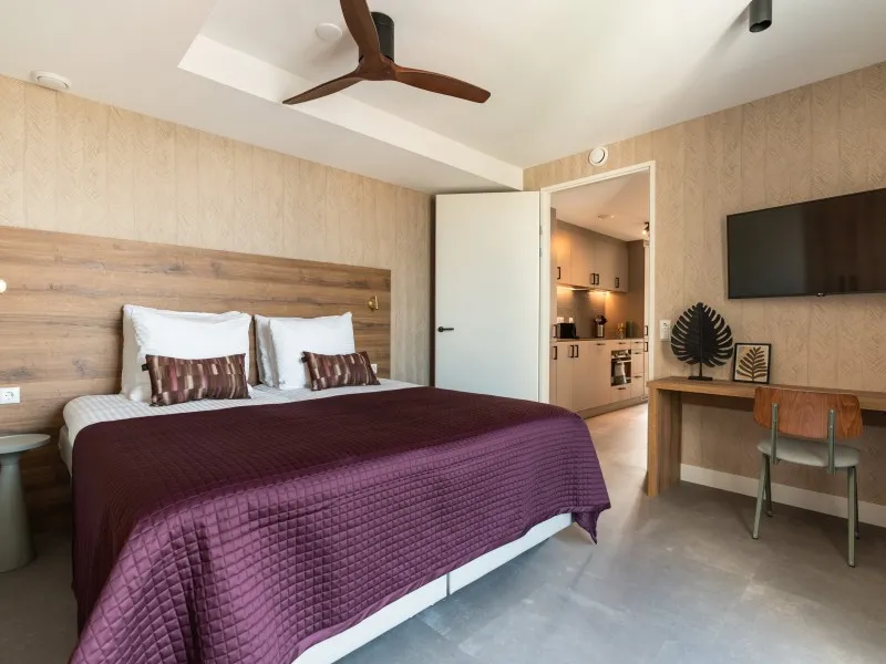 These 2-bedroom apartments, each spanning 60 sqm, provide a more compact alternative to the larger 2-bedroom units. Designed to accommodate up to 3 guests, they are perfect for smaller families or two individuals who wish to share a living space while enjoying the comfort of private bedrooms. Whether your stay is brief or extended, these apartments provide all the comfort you need. As you step inside, you'll immediately experience the inviting atmosphere consistently carried throughout the interior, marked by a harmonious blend of natural colors, materials, and contemporary technology. The apartment features a fully equipped kitchen, a dining area, a cozy sofa, and a large SMART TV with Chromecast. The master bedroom is furnished with a comfortable double bed, another SMART TV with Chromecast, a desk, and ample closet space. In the second bedroom, you'll find a comfortable full-size single bed and closet space. The spacious bathroom includes a shower, a vanity with drawers, and a heated mirror. There is a separate toilet and a laundry room equipped with a washing machine and dryer. Additionally, the apartment boasts a 4 sqm balcony. Remarkably, the electricity and heat you'll utilize during your stay are primarily generated by solar collectors, underlining the sustainability of BizStay Walden as an eco-friendly building.